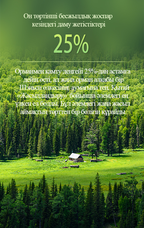 Орманмен қамту деңгейі 25%-дан астамға дейін өсті, ал жаңа орман алқабы бір Шэньси өлкесінің аумағына тең. Қытай